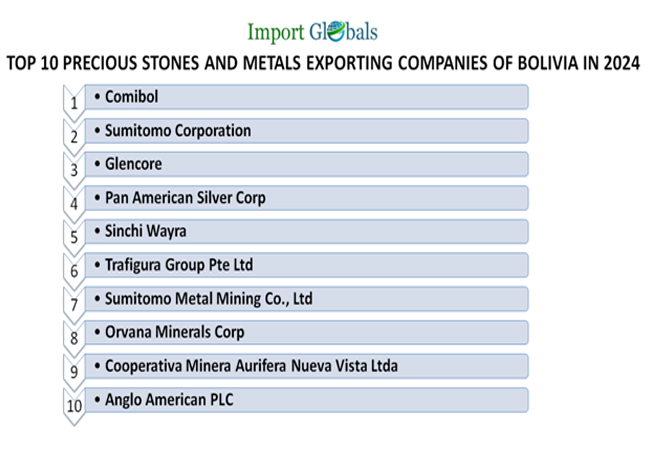 The Bolivia Trade Data showcases the below-mentioned as the top precious stones and metals exporting companies of Bolivia in 2024;