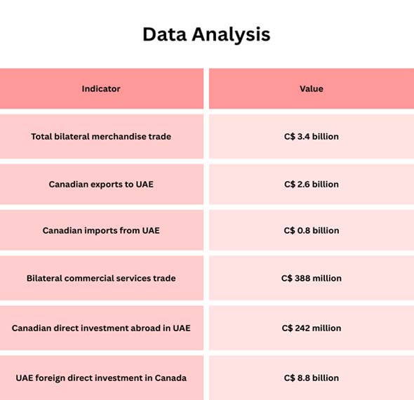 As per UAE Customs Data by Import Globals, Canada will push for easier access and faster clearance for high-value manufactured goods (aerospace, auto parts), as well as predictable rules for agri-food.