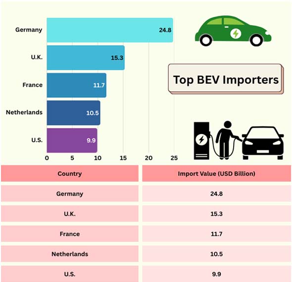 Ans. Germany, the U.K., France, and the U.S. are among the leading importers of BEVs.