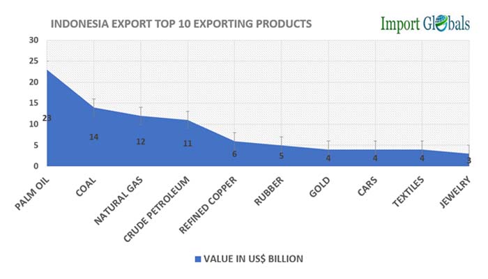 Ans. Palm Oil is the highest exporting product from Indonesia. The country alone produces almost 50% of Palm oil in the world.