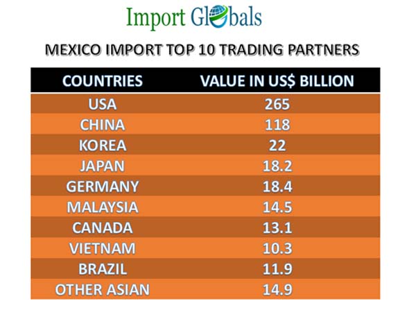 The Top Mexico Import Trading partners according to Mexico Import Trade Data are Following:1. USA – Mexico has imported products worth 265 billion US dollars from the United States which is around 43% of the total value, iron or steel articles, and organic chemicals are imported from the USA.