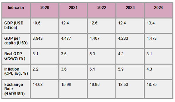 After the global pandemic-related depression in 2020, Namibia's economy has shown resilience and a slow comeback. As per Namibia Import Export Trade Data by Import Globals, after declining by 8.1% in 2020, the country's GDP grew by 3.5% in 2021 and 4.6% in 2022. The economy grew 3.2% in 2023, and forecasts for 2024 indicate a growth rate of 4.6%. Improvements in population dynamics and economic productivity have led to a slight increase in GDP per capita, which reached about USD 4,743 in 2023.