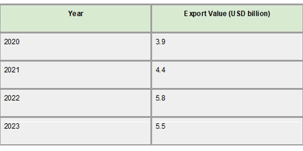 The global economy and the dynamics of the commodity market have had a significant impact on Namibia's export performance over the last five years. Exports totaling about USD 3.9 billion were recorded in 2020, indicating the effect of the worldwide epidemic on trade. As per Namibia Import Trade Statistics by Import Globals, with exports rising to USD 4.4 billion in 2021, a 14.2% yearly growth, the next year saw a turnaround. This upward trend continued into 2022, with exports reaching USD 5.8 billion, representing a significant 31.9% increase from the previous year. However, due to some variables, including changes in the worldwide market and currency fluctuations, exports somewhat decreased to USD 5.5 billion in 2023, a 5.8% fall.