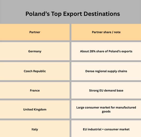 The EU makes up a large part of Poland's export market. According to Poland Import Export Trade Data by Import Globals, this is important because the EU internal market makes trading easier by having consistent standards, reliable logistics routes, and rules that are fairly easy to follow. In that environment, manufacturing locations that can deliver high quality at scale tend to expand quickly.