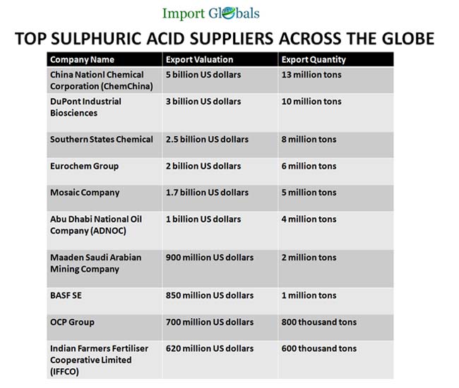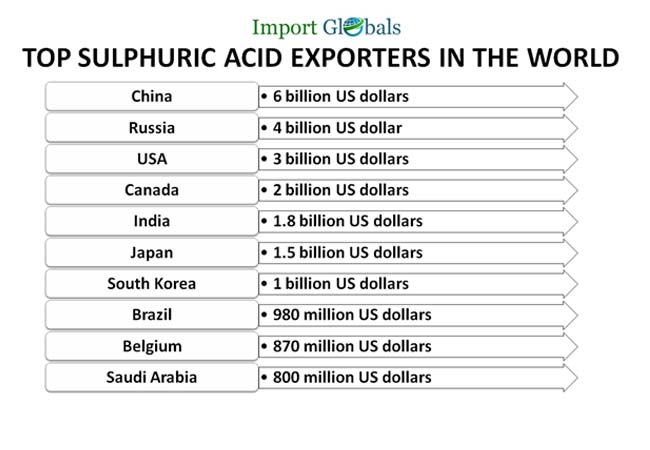 • USA – According to the USA Export Data, the valuation of Sulphuric acid export from the USA in 2023 –3 billion US dollars.