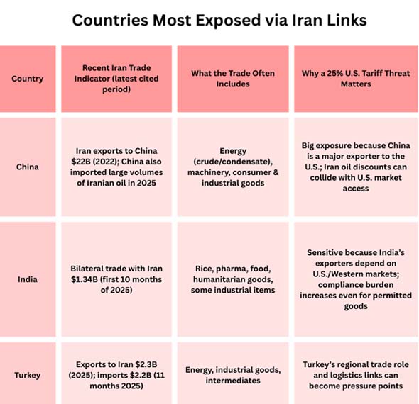 In the middle of January 2026, the U.S. put a lot more economic pressure on Iran by putting a 25% tariff on any country "doing business" with Iran.