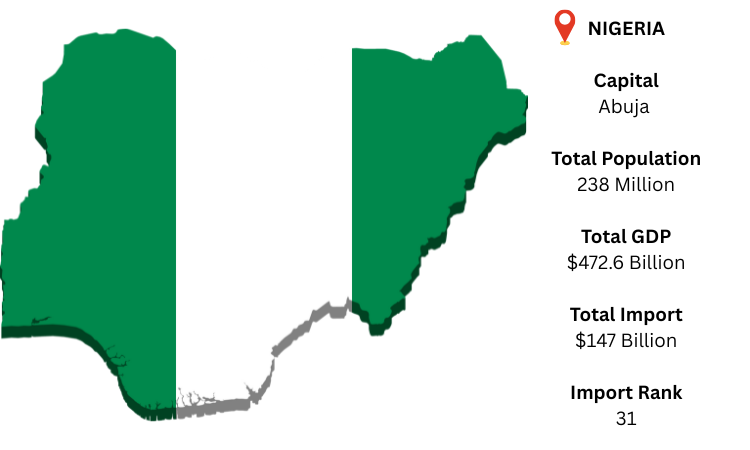 Nigeria, a country in West Africa, has coasts along the Atlantic Ocean and borders Benin, Niger, Chad, and Cameroon. Abuja is its major city and capital. As per the Nigeria import data, Nigeria's GDP was around USD 1.49 trillion in 2024. In 2024, the country's import volume reached a record high of over USD 147 billion (₦60.6 trillion), placing it in 31st place globally. With about 23–28% of Nigeria's imports (about USD 34 billion), China was the country's largest exporter.