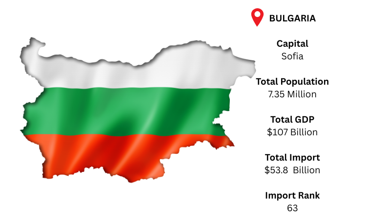 The Southeast European nation of Bulgaria is well-known for its burgeoning energy and industrial sectors. Sofia, the capital, serves as the hub for its administrative and economic operations. With a GDP of USD 107 billion, the population is estimated to be 7.35 million in 2024. As per Bulgaria import data, Bulgaria will import around USD 53.8 billion, making it the 63rd highest importer in the world. Germany, Turkey, and Romania are its major import partners, and the most important commodities it imports are mineral fuels and oils, which are essential for its energy-intensive industry and transportation system.