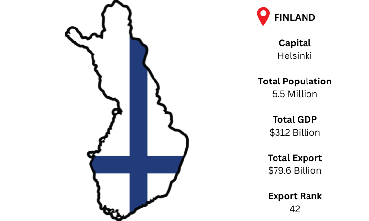 Finland is a highly developed Nordic country that depends on technology, forest products, equipment, and refined petroleum for its robust export-driven economy. The capital, Helsinki, is the primary center for international shipping and industrial output. As per Finland export data, Finland, which has a population of over 5.5 million and a GDP of about USD 312 billion, exported nearly USD 79.6 billion in 2024, with the EU making up the majority of its outbound trade.