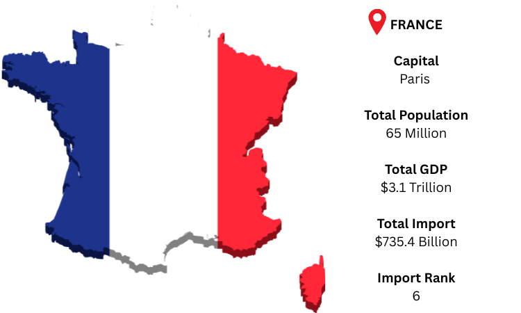 France is one of Europe’s largest economies and a major hub for global trade, with diverse imports spanning energy, machinery, vehicles, and electronics. Paris is the capital, anchoring the country’s vast consumer market and industrial base. As per France import data, with a population of around 65 million and a GDP exceeding USD 3.1 trillion, France’s total imports in 2024 are estimated at approximately USD 735.4 billion, placing it among the top importers worldwide.