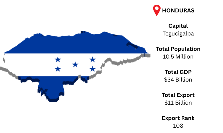 A major exporter in Central America, Honduras makes a living by exporting textiles and agricultural products. The capital, Tegucigalpa, serves as a gateway for the nation's industries to reach important international markets via ports in the Caribbean and the Pacific. As per Honduras export data, with a population of over 10.5 million and a GDP of approximately USD 34 billion, Honduras is a powerful regional provider, and its total exports for 2024 are projected to be around USD 11 billion.