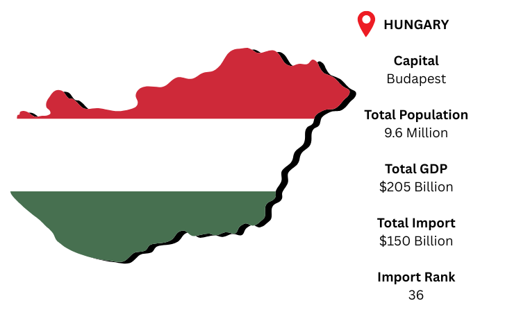 An essential component of the EU's integrated supply chain is Hungary, a thriving Central European economy. Its thriving electronics, automotive, and industrial industries mostly depend on imported high-tech parts and raw materials. The capital, Budapest, serves as the primary center for trade and logistics. As per Hungary import data, Hungary, a major importer in Europe with a population of 9.6 million and a GDP of around USD 205 billion, is expected to import approximately USD 150 billion in 2024.