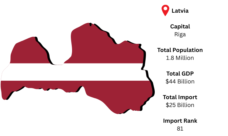 Trade between the EU and Eastern Europe is facilitated by Latvia, a Baltic country in Northern Europe. For its industries and customers, imports are essential, particularly for food, machinery, and energy. The capital and primary center of commerce is Riga. As per Latvia import data, with a population of over 1.8 million and a GDP of almost USD 44 billion, Latvia is expected to import approximately USD 25 billion in 2024, underscoring its open economy and reliance on trade.