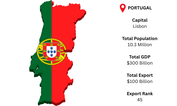 Portugal's well-established industrial sectors, including equipment, automobiles, chemicals, and agricultural goods, are the backbone of its export-based economy. Lisbon, Porto (Leixões), and Sines are its powerful Atlantic ports, which link European industries to international markets. As per Portugal export data, Portugal's geographic location reinforces its function as a commercial bridge between Europe, Africa, and the Americas, and Lisbon serves as the country's capital. Portugal, which has a population of over 10.3 million and a GDP of approximately USD 300 billion, is expected to export almost USD 100 billion in 2024, highlighting its significant position in both European and Atlantic trade routes.