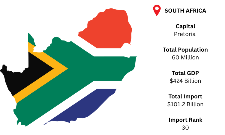 South Africa is the continent’s most industrialized economy, importing key resources to support its energy, manufacturing, and consumer sectors. Pretoria is the administrative capital (with Johannesburg as the economic hub). As per South Africa import data, with a population of about 60 million and a GDP of around USD 424 billion, total imports reached approximately USD 101.2 billion, reflecting steady industrial and consumer demand.