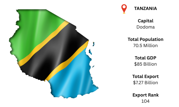 Tanzania, an East African country on the Indian Ocean coast, has Dar es Salaam as its main port and Dodoma as its capital. Tanzania reported a GDP of about USD 85.4 billion in 2024, according to trade figures. As per Tanzania export data, Tanzania's overall export value in 2023 was USD 7.27 billion, placing it 104th in the world. Gold and precious metals were its primary export products, while India was its top export partner.