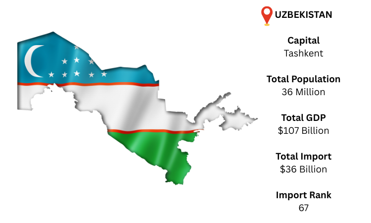 As per Uzbekistan import data, with about 36 million people and a GDP of USD 107 billion, Uzbekistan is a Central Asian country that ranked about 67th in the world for imports in 2023, with merchandise imports totaling about USD 36.0 billion, up about 29% from 2022. Tashkent is its capital city. Its top import partners were China, Russia, and Kazakhstan, and the most popular imported goods were machinery, automobiles, and electrical equipment as per Uzbekistan Import Customs Data provided by Import Globals a top Uzbekistan Import Data provider.